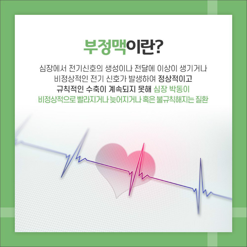 심장 부정맥은 심장의 정상적인 심박수 리듬에서 벗어나는 현상을 말합니다. 심장은 정상적으로 일정한 속도와 강도로 수축해 혈액을 체내로 순환시키는데, 이 과정에서 발생하는 심박수는 일정한 패턴을 가지고 있습니다. 그러나 심장 부정맥은 이 패턴에서 벗어나거나 불규칙한 심박수를 나타내는 것을 의미합니다.심장 부정맥은 다양한 형태로 나타날 수 있으며, 가장 일반적인 형태로는 심방세동, 심방조기수축, 심실세동 등이 있습니다. 이런 부정맥은 심장의 전기적인 활동에 이상이 생기거나 심장 조절 기능에 문제가 생길 수 있습니다.