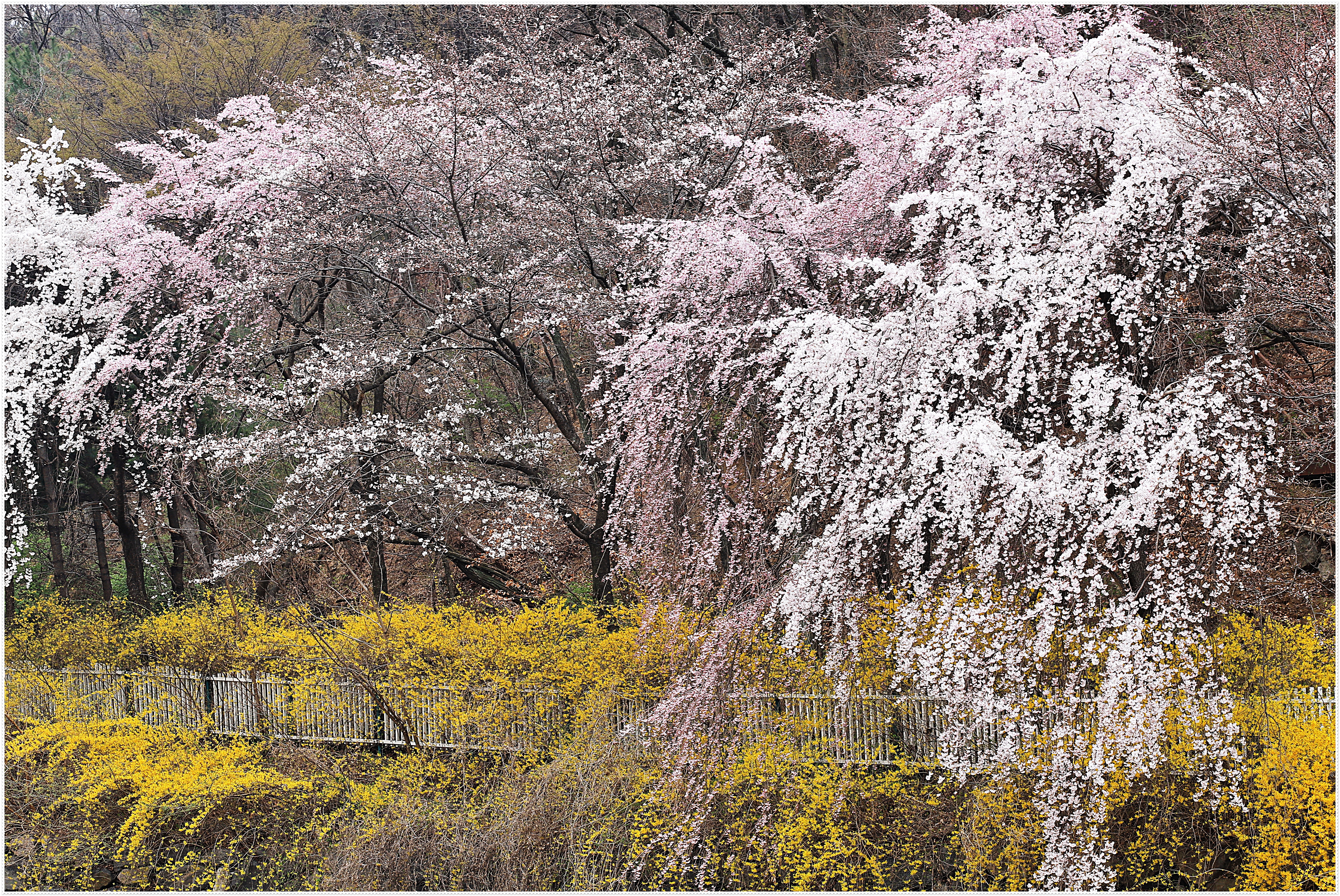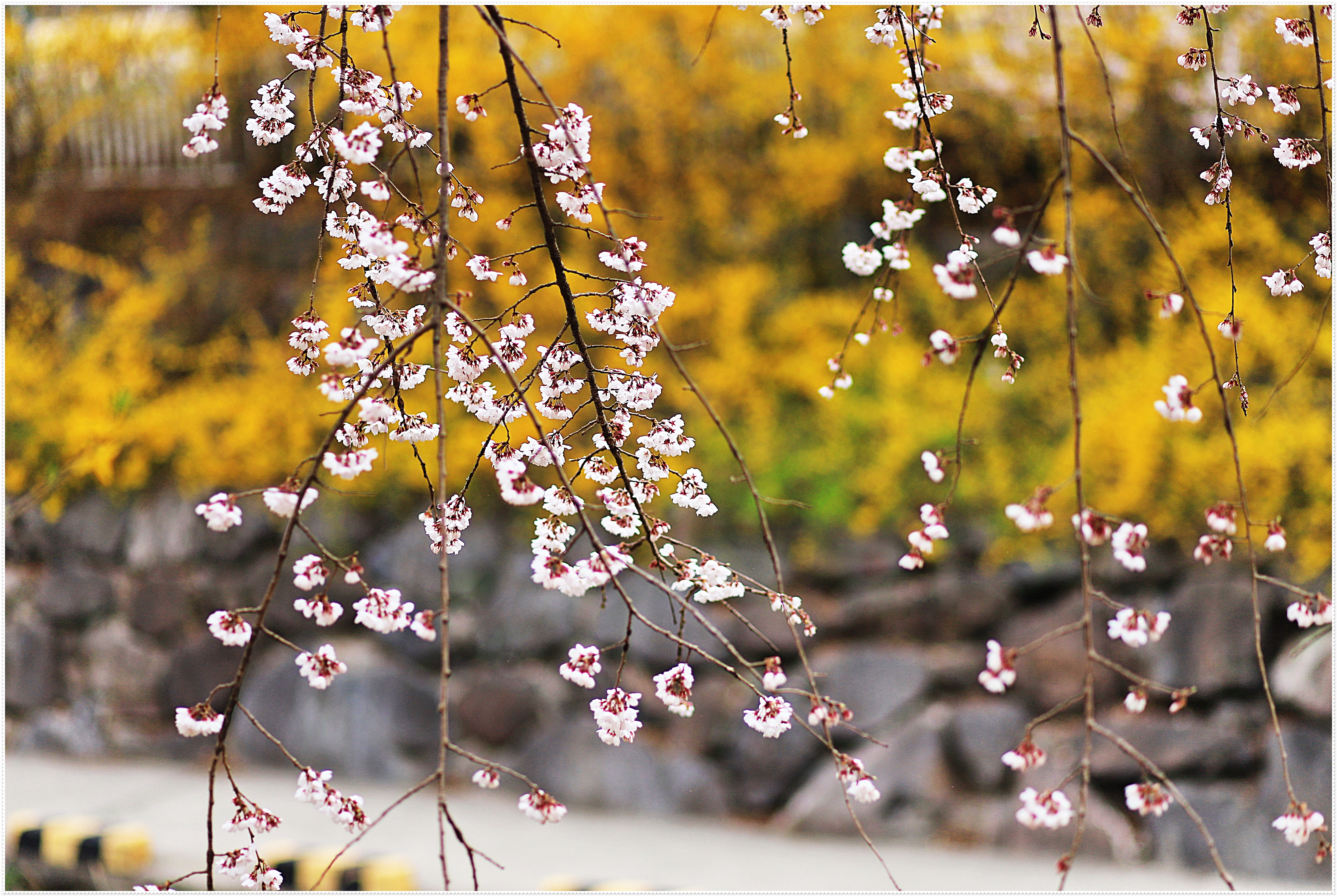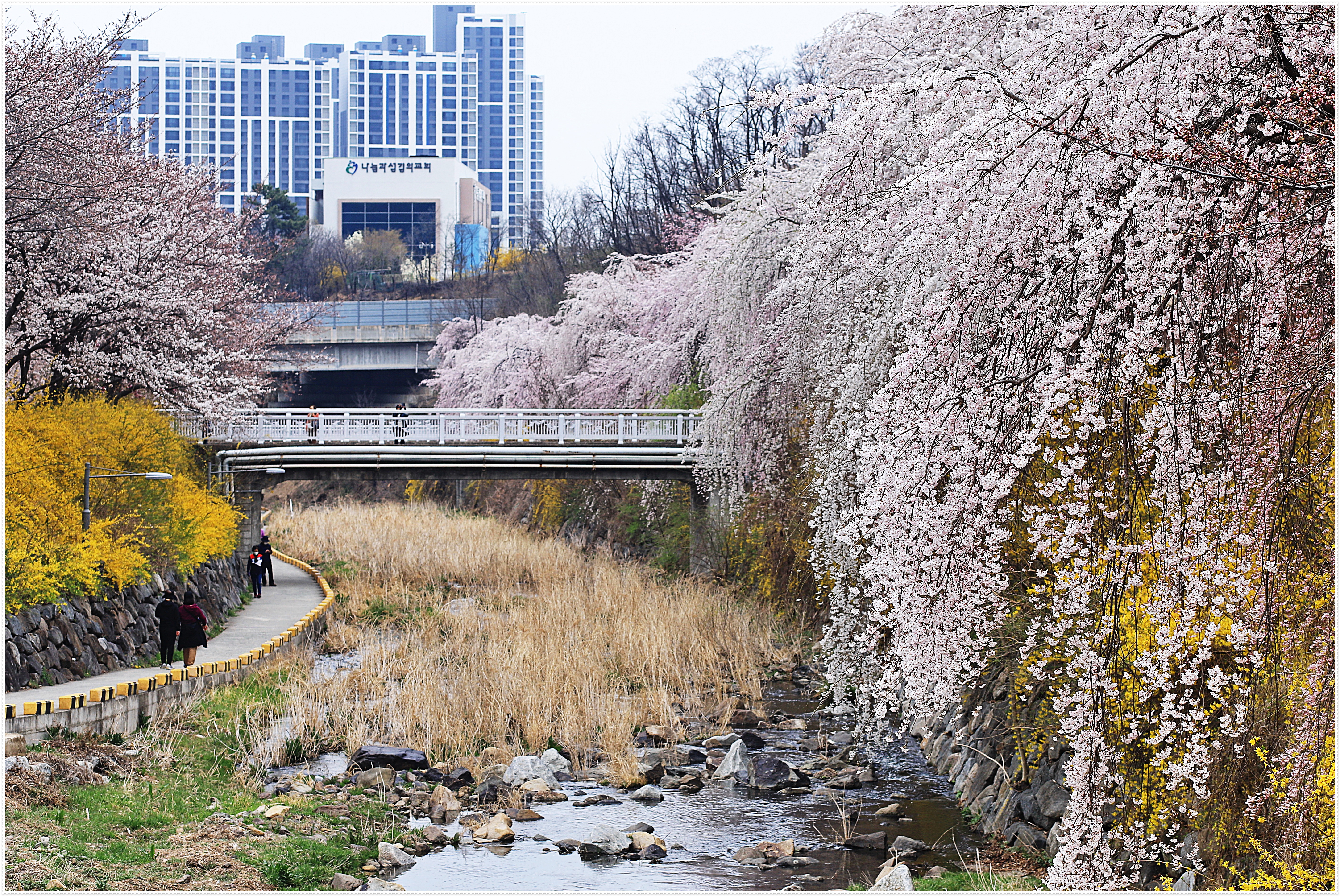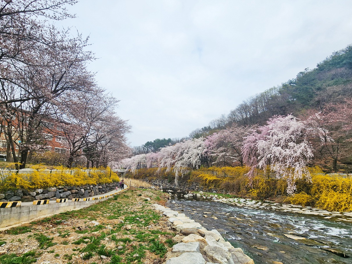 억수천 수양벚꽃이 고개를 숙인 채 활짝 피어 있다.