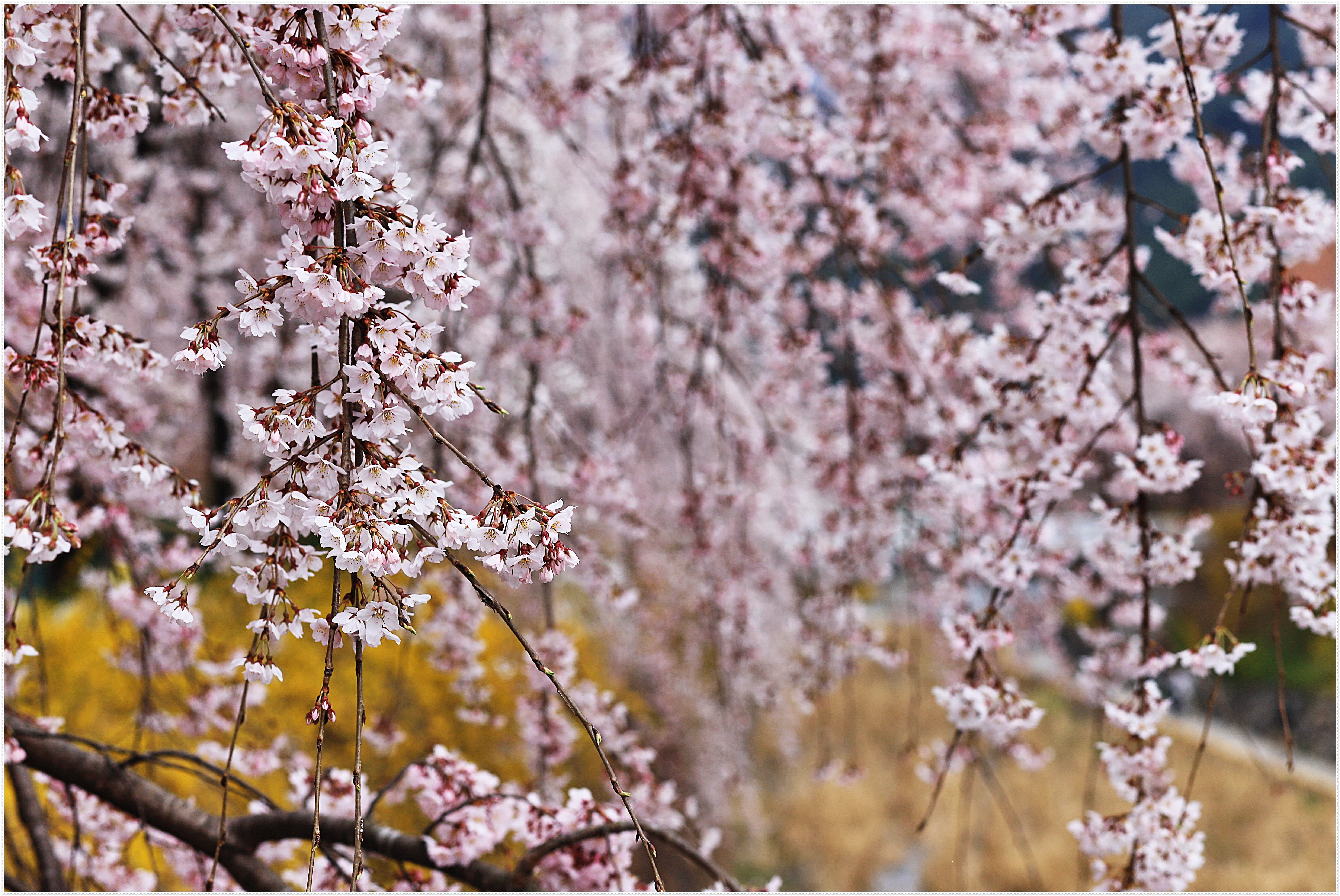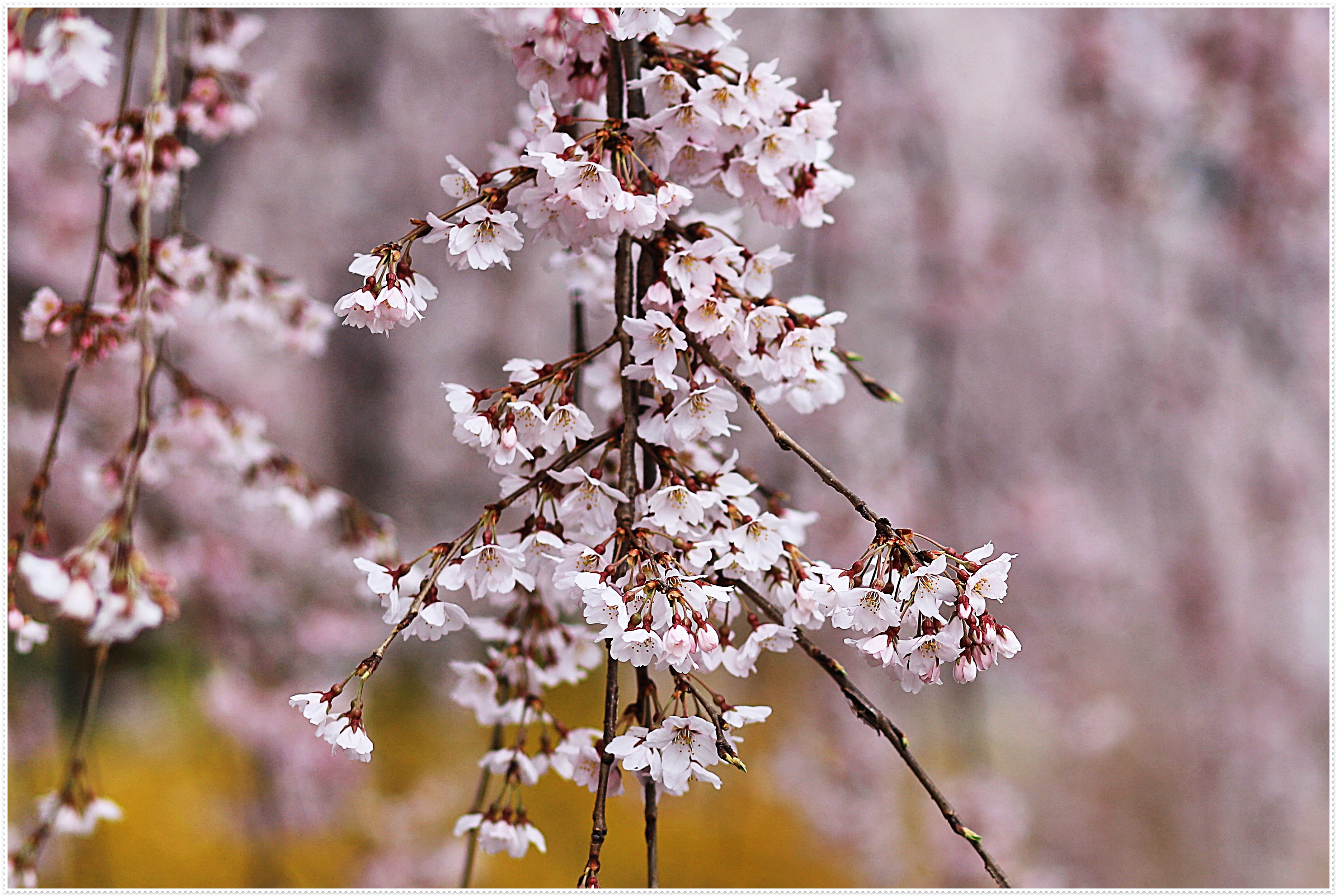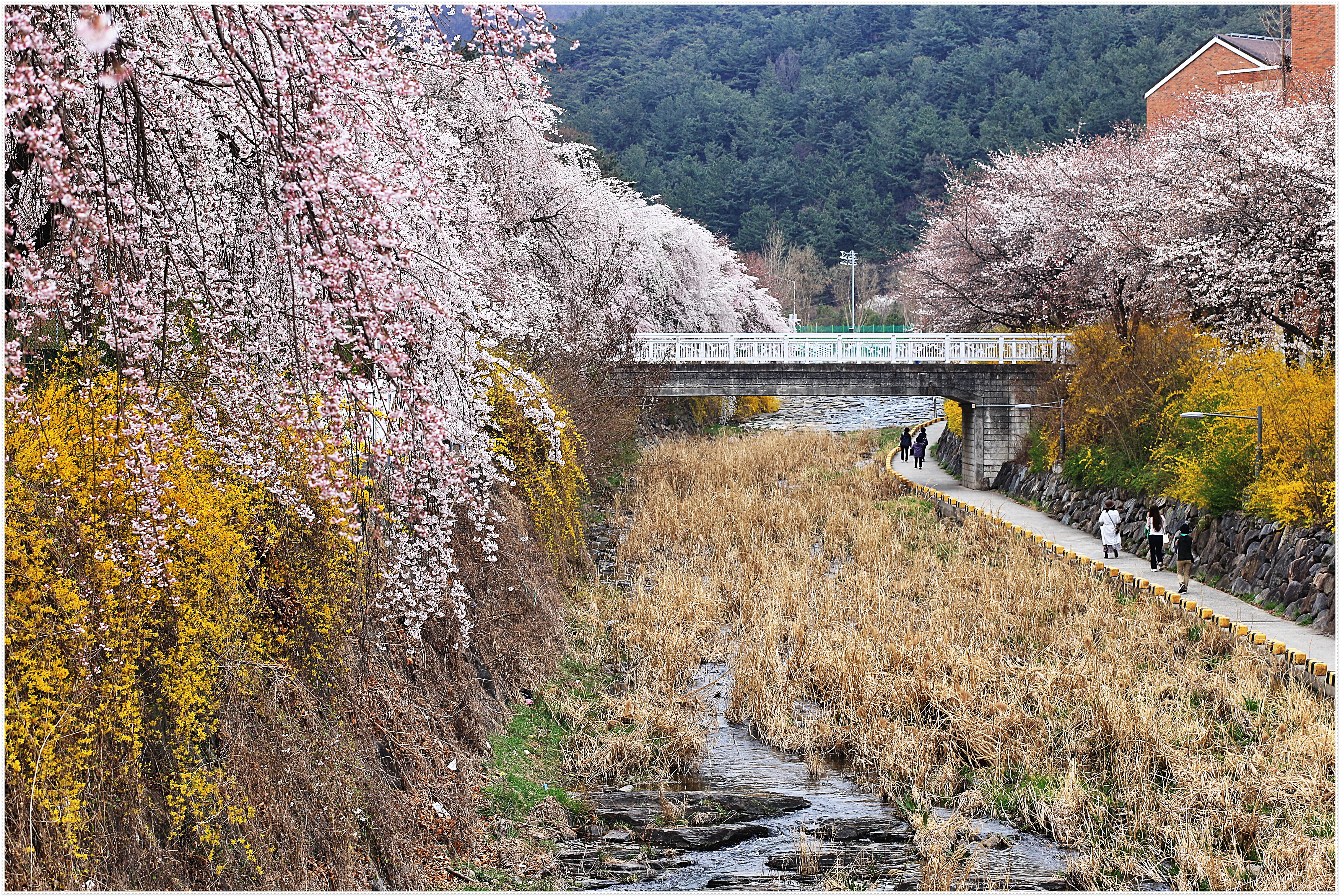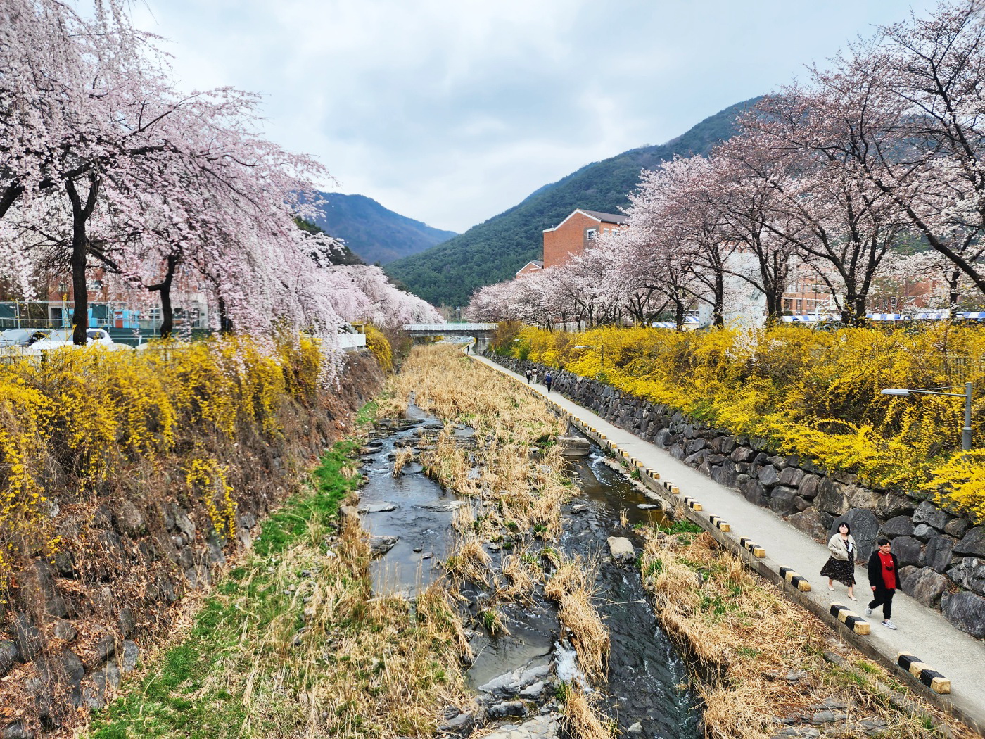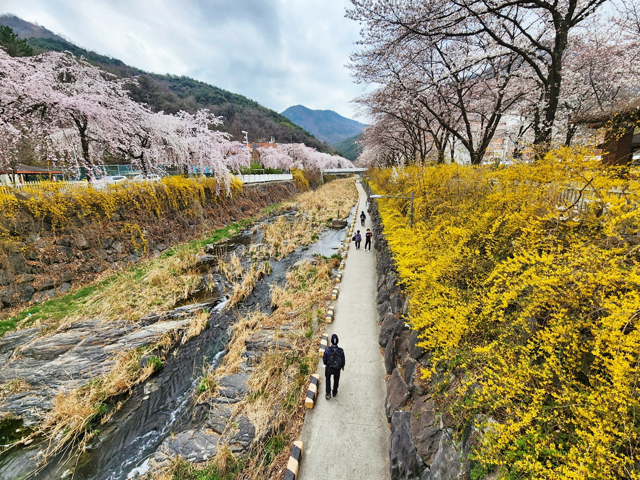 억수천 수양벚꽃이 고개를 숙인 채 활짝 피어 있다.