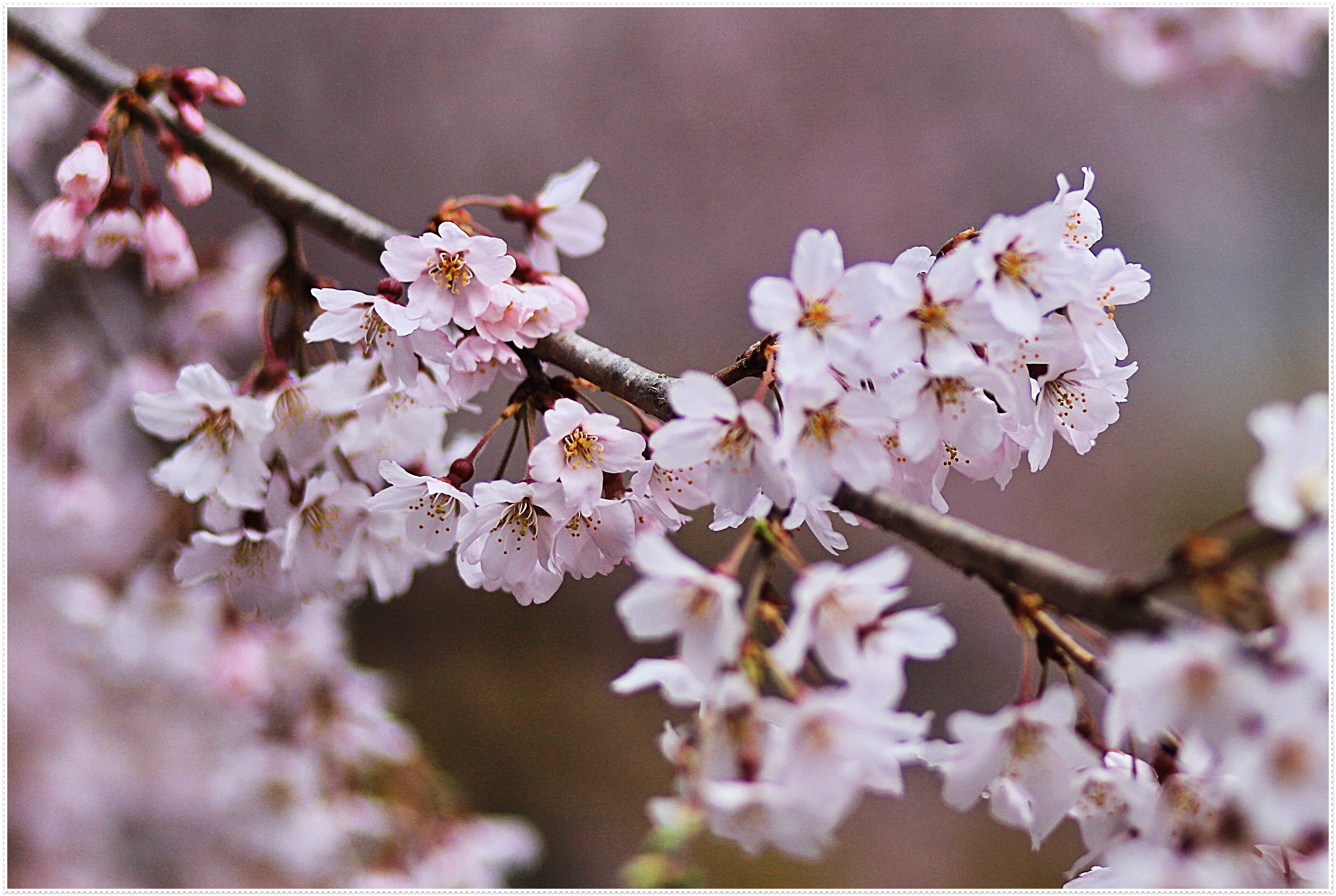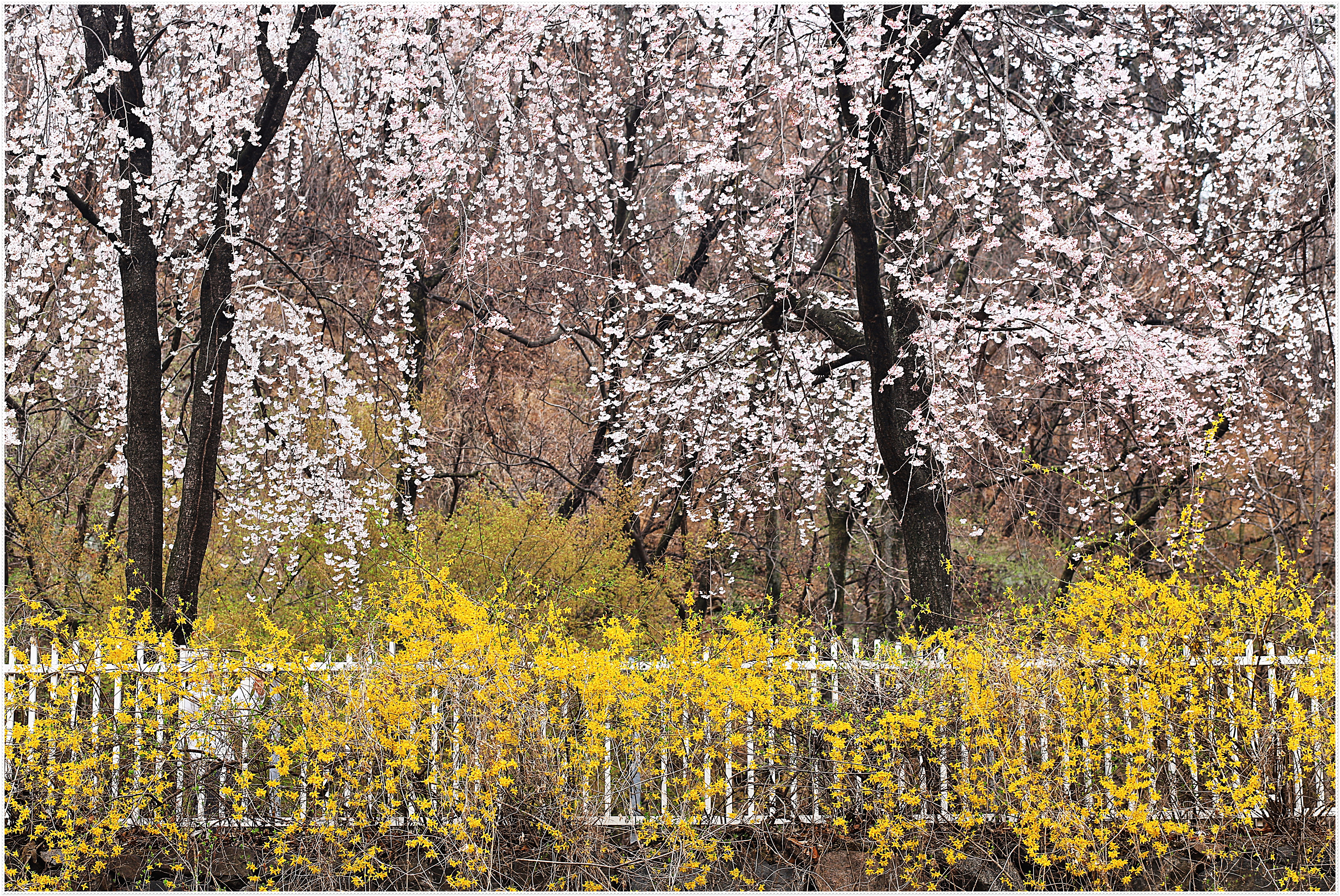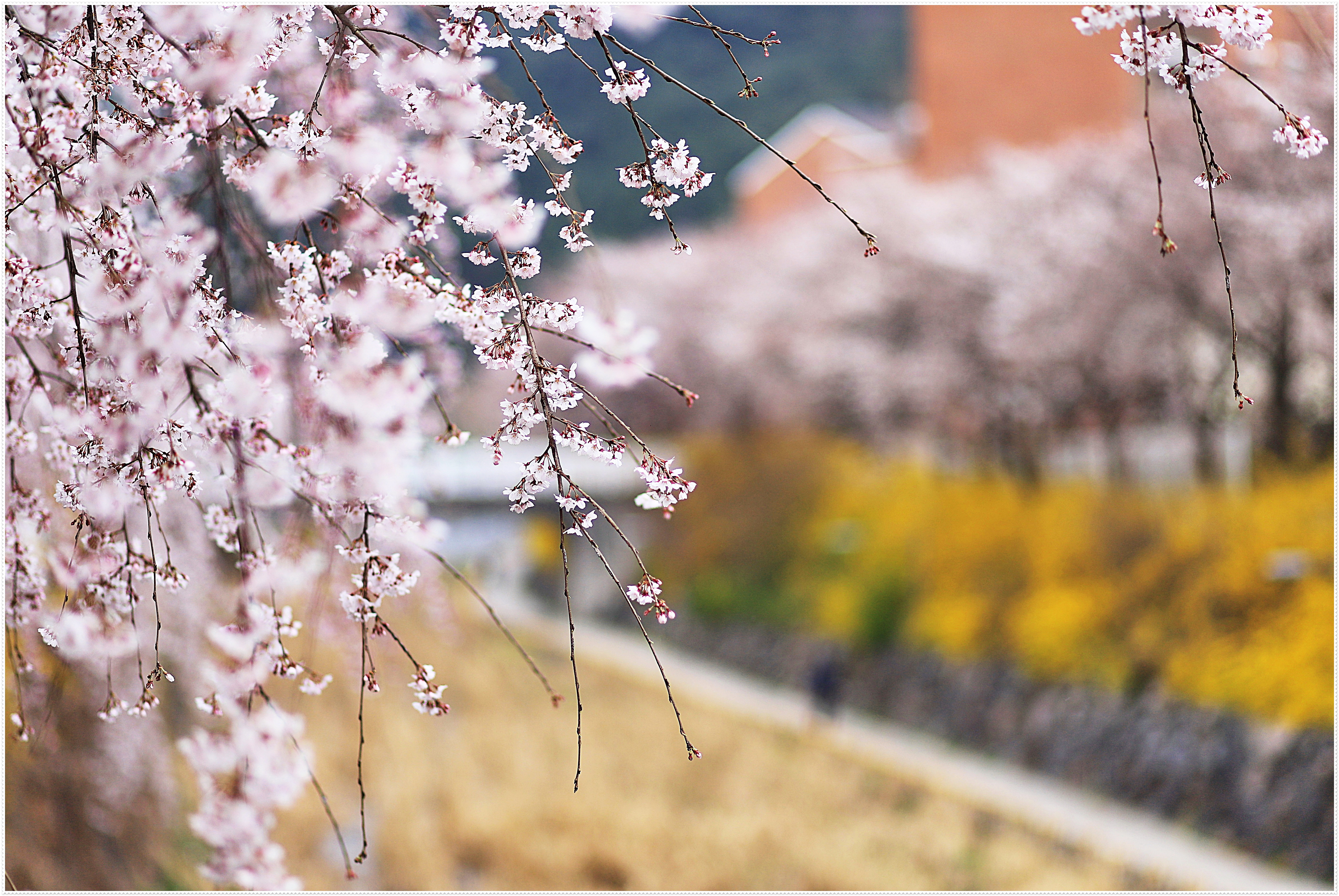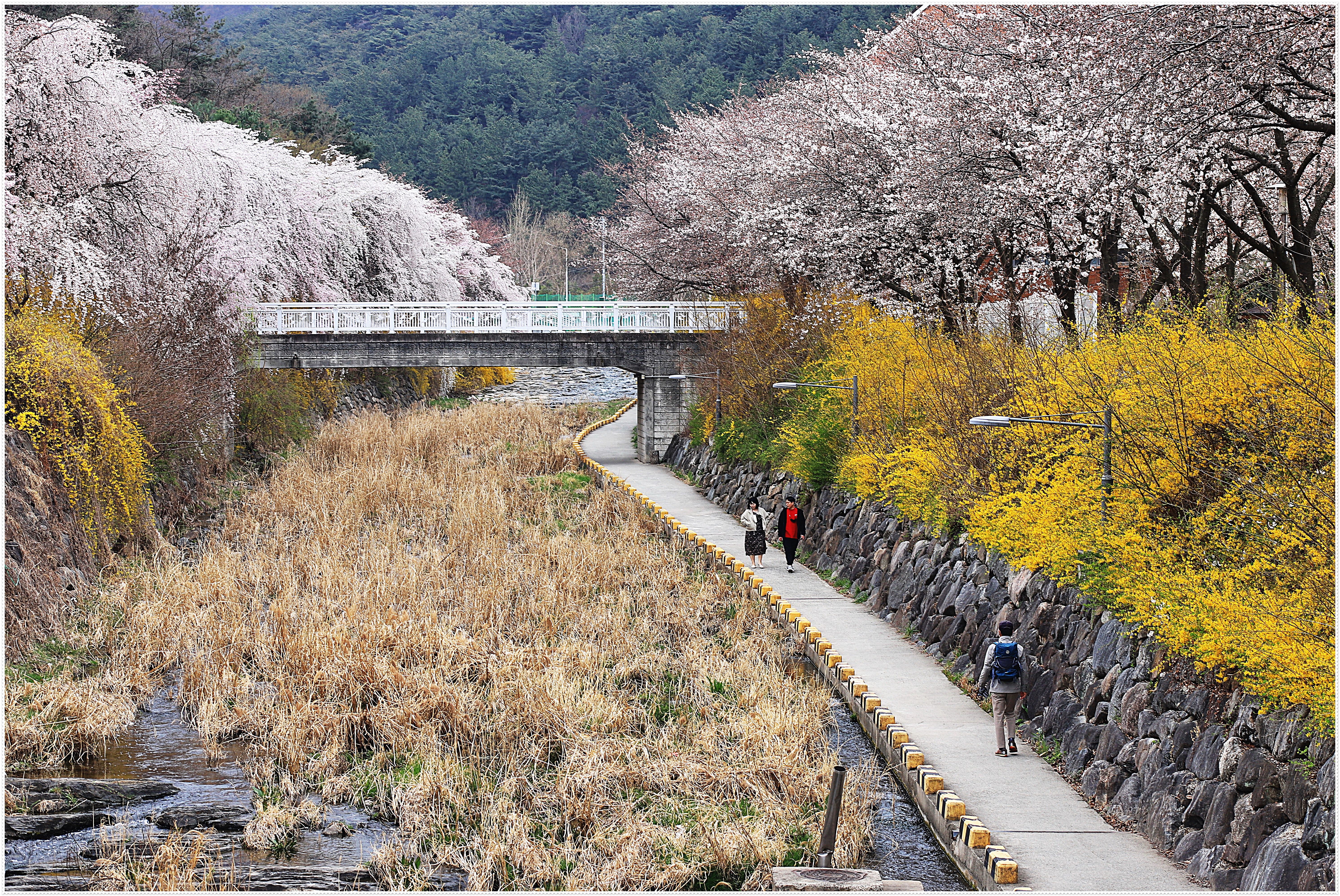 억수천 수양벚꽃이 고개를 숙인 채 활짝 피어 있다.
