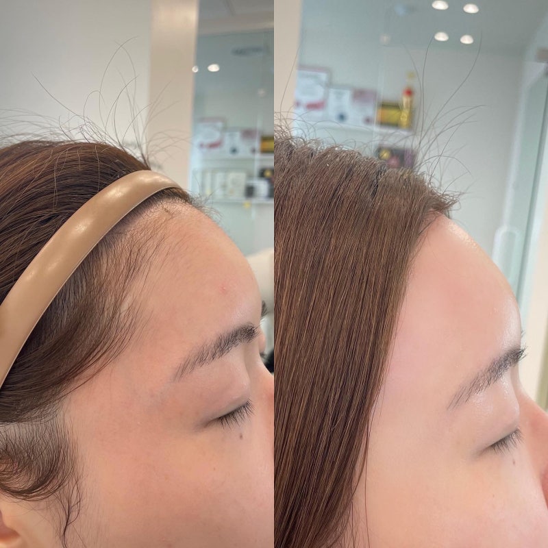 헤어라인 타투도 괜찮지만 커버메이크업으로 헤어라인을 정돈할 수 있습니다.어두운 섀도우로 헤어라인을 따라 그려주세요.커버 메이크업은 외출할 때마다 해야 한다는 단점이 있습니다.
