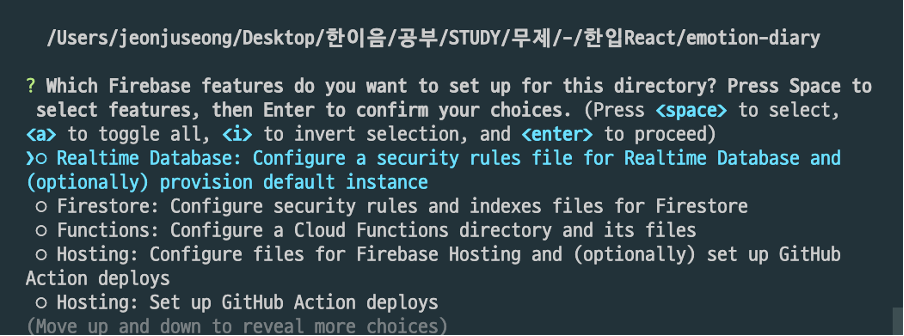 Firebase 초기화 명령을 입력합니다.